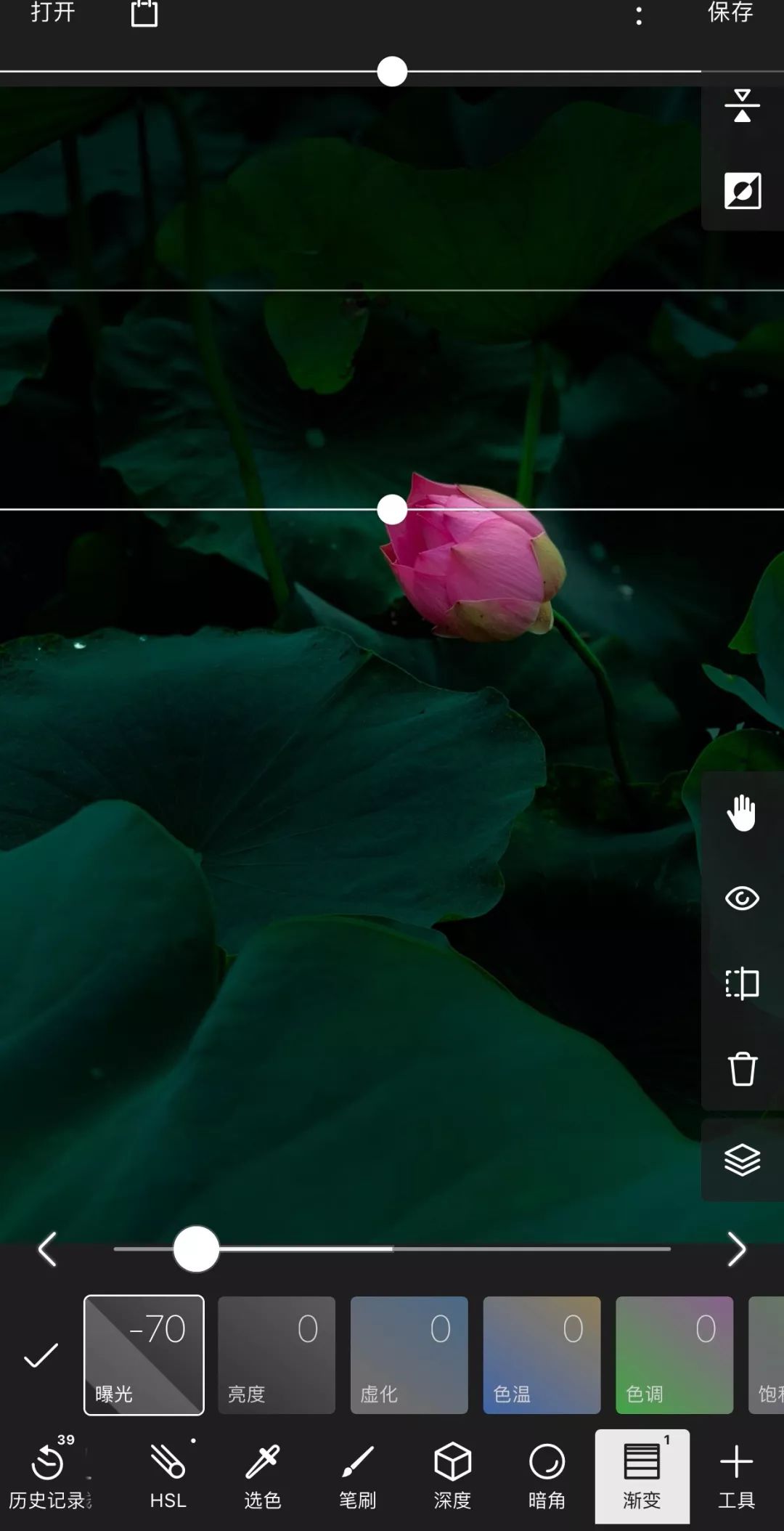 拖动渐变(线条)的位置至背景部分,调整范围不要覆盖到荷花,然后把曝光降低-70,背景的曝光就变暗了,且曝光的过渡比较自然:
