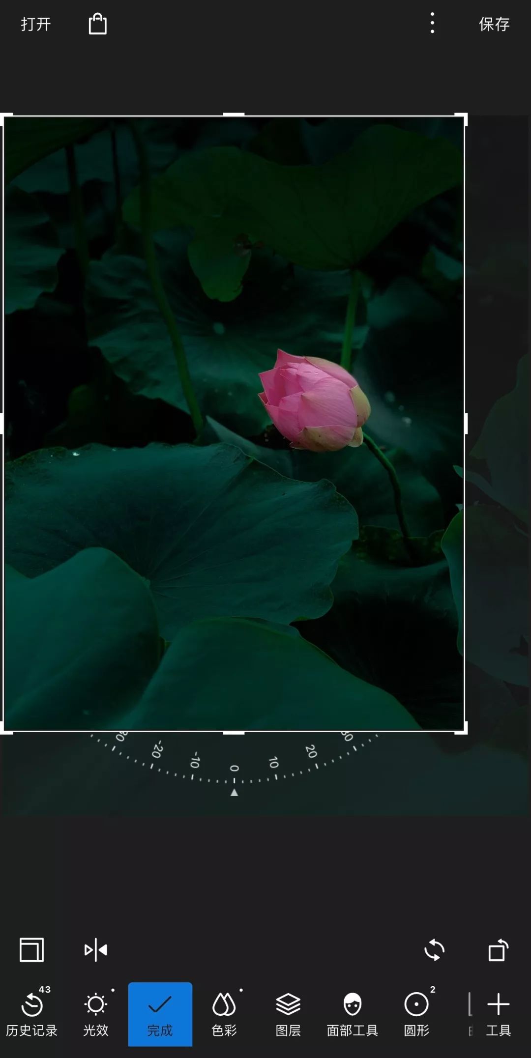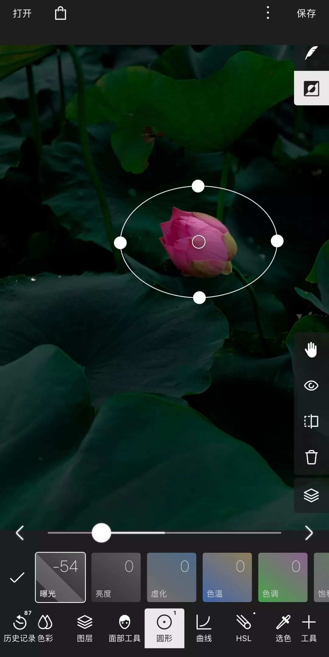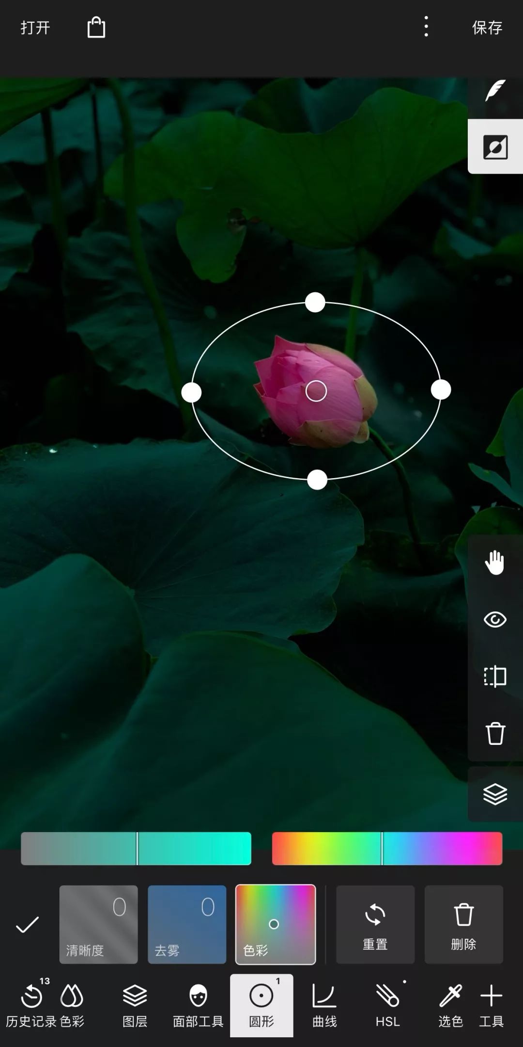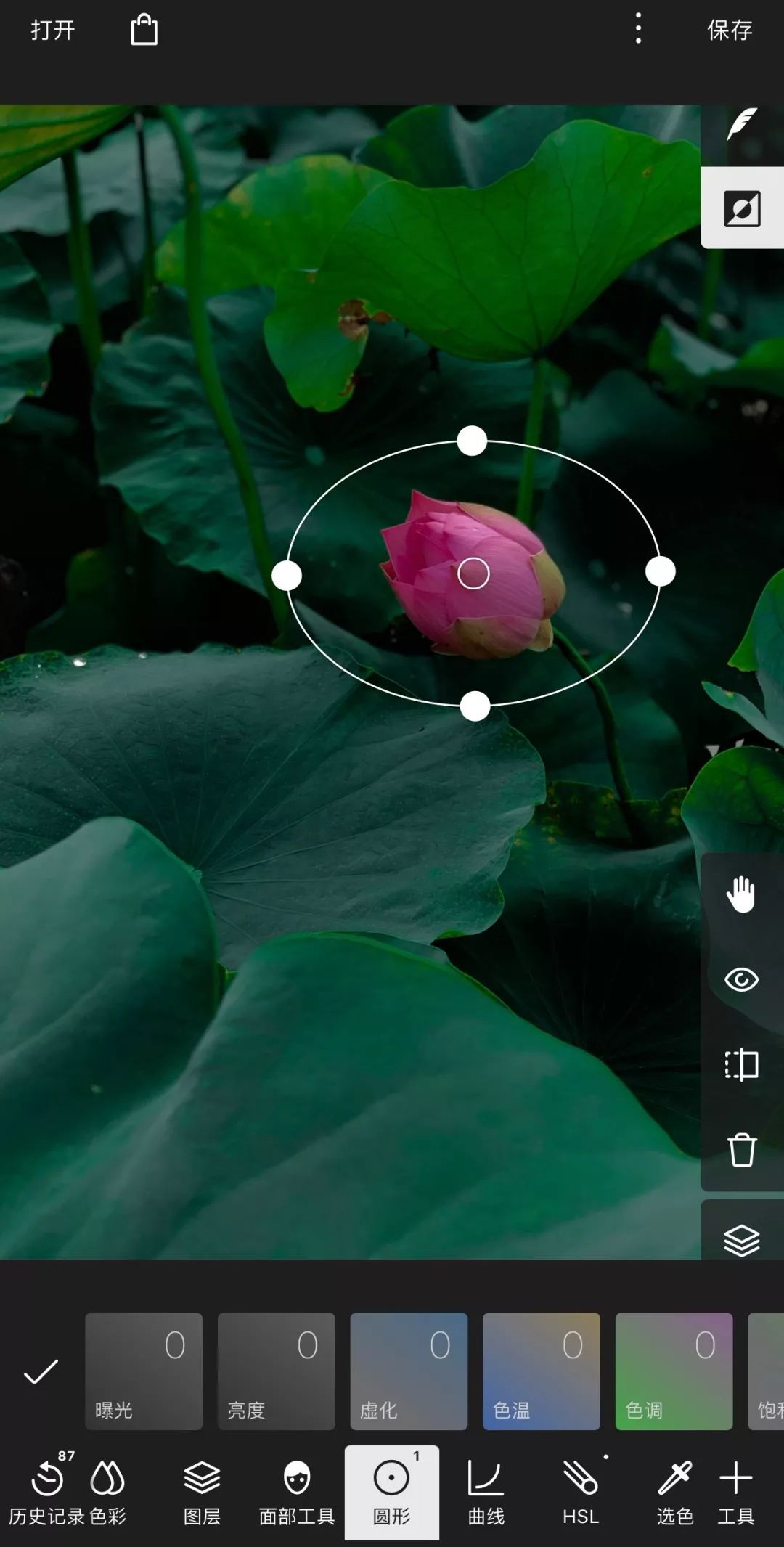 新建第1个圆形工具,两个手指拖动圆框大小和位置,使之框住荷花,同时点击右上角“反选”按钮,也就是羽毛下面的这个按钮: