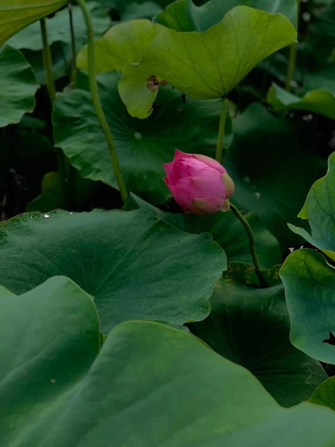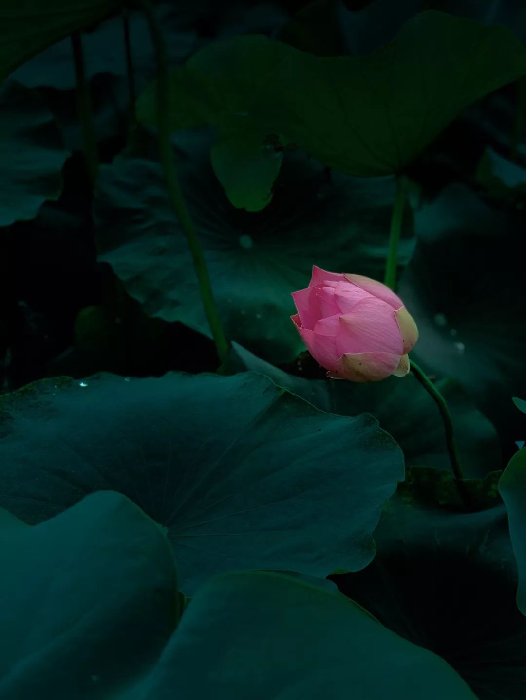 暗调青绿色的照片在视觉上给人一种宁静、深沉的氛围,同时荷花主体的细节和颜色又能得到很好的凸显,例如来看下面的照片: