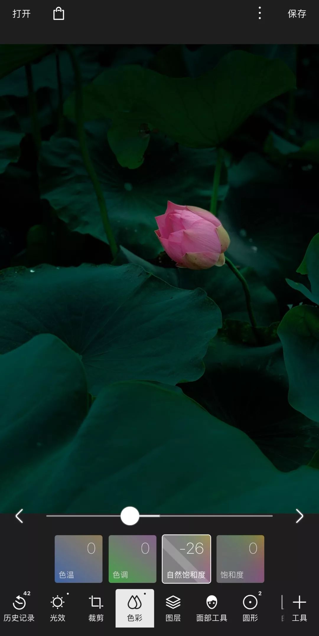 这一步,主要把自然饱和度适当降低,主要让荷花的粉红色变得淡雅一些,不那么艳丽: