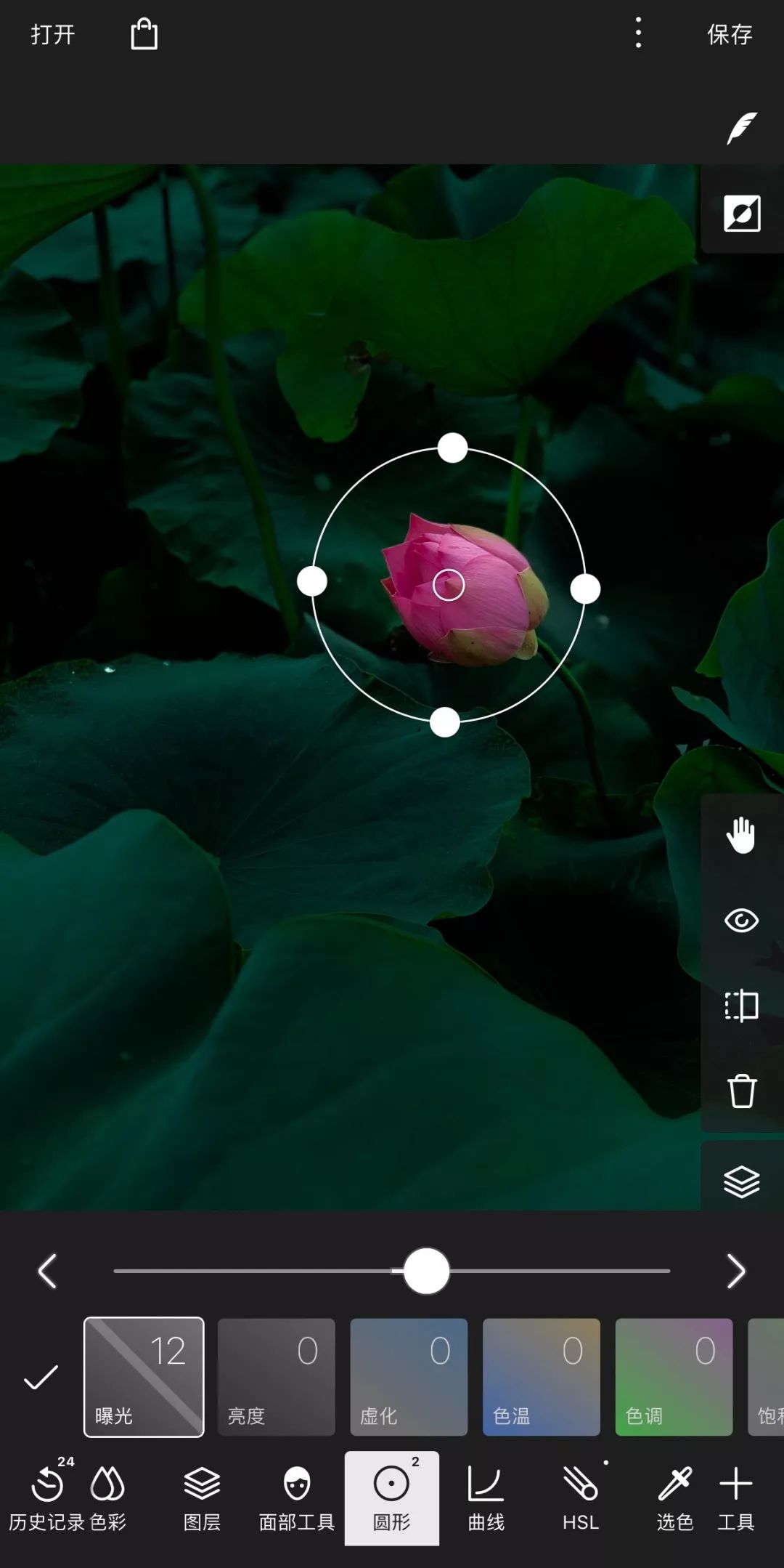 再新建第2个圆形工具,目的是增加荷花部分的曝光。同样调整圆框大小与位置,使之把荷花框住,然后把曝光提升到12,让花朵部分变得明亮一些: