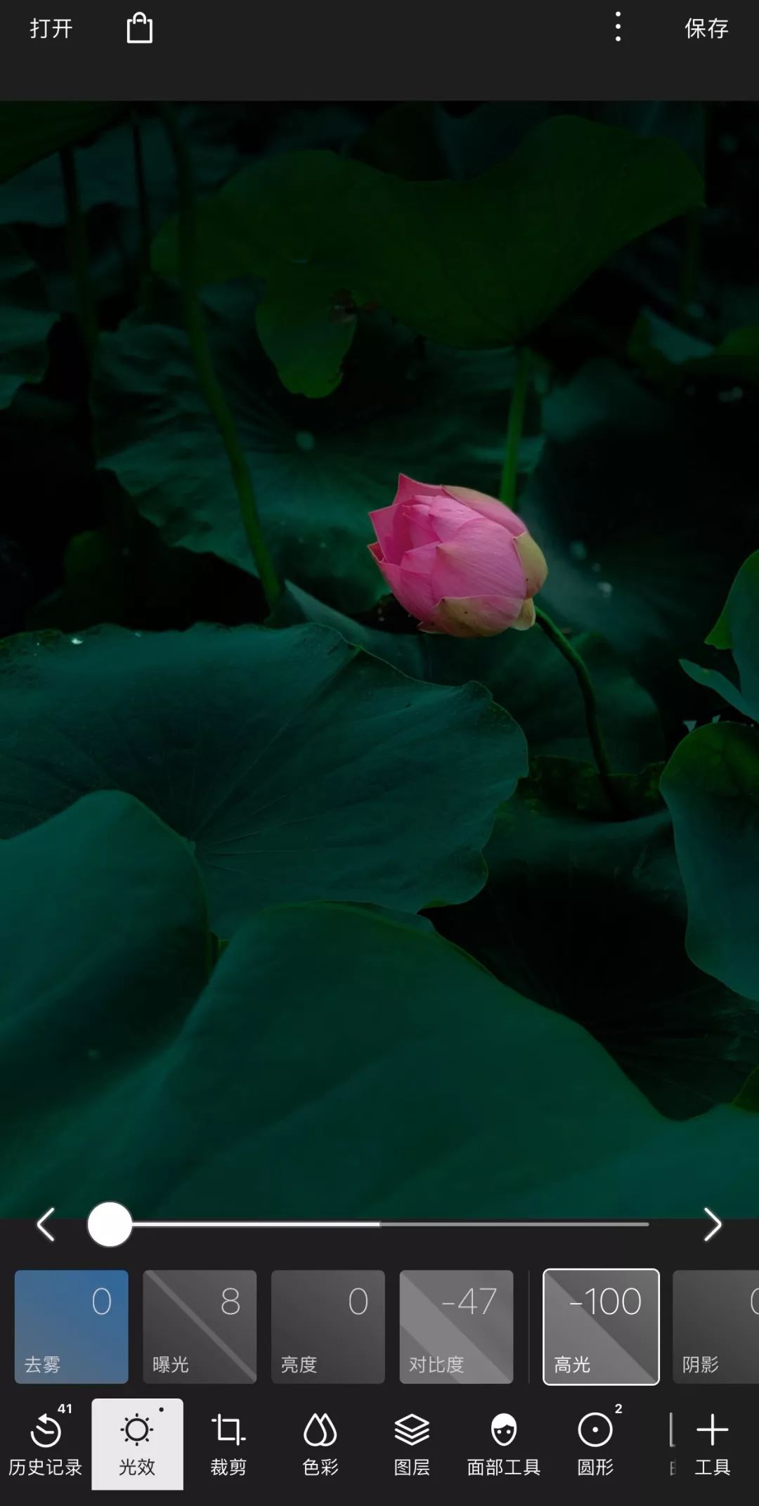 经过以上几个步骤的调整,基本的影调已经确立了,接下来对照片的整体进行微调。进入【光效】工具,曝光增加8、对比度降低-47、高光降低-100,主要是让照片的明暗对比不要过强:
