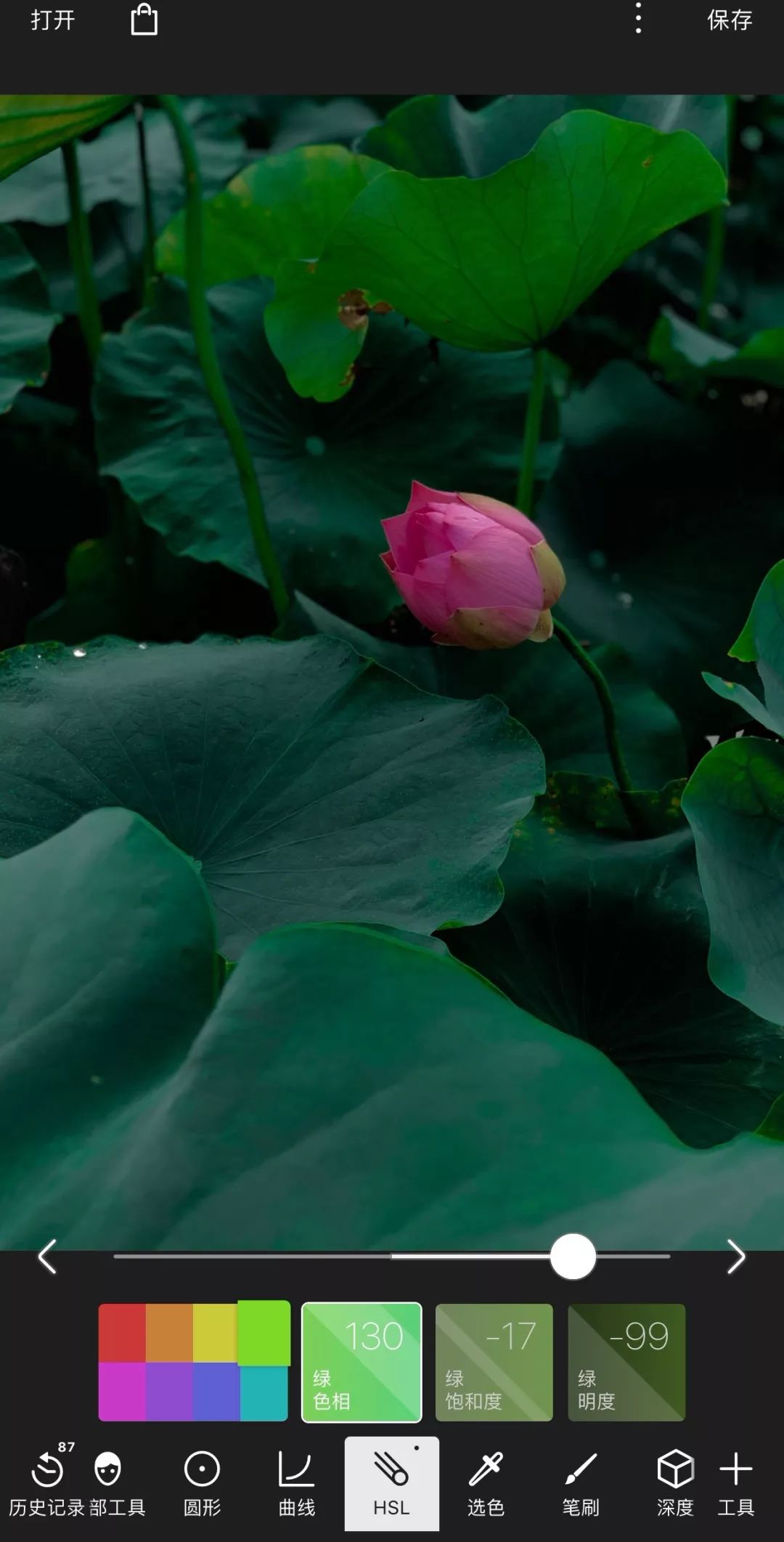 进入软件,打开原图,首先进入【HSL】工具,这一步的主要目的是把荷叶的浅绿色变成深沉的墨绿色,浅绿色显得艳丽,而墨绿更显淡雅。