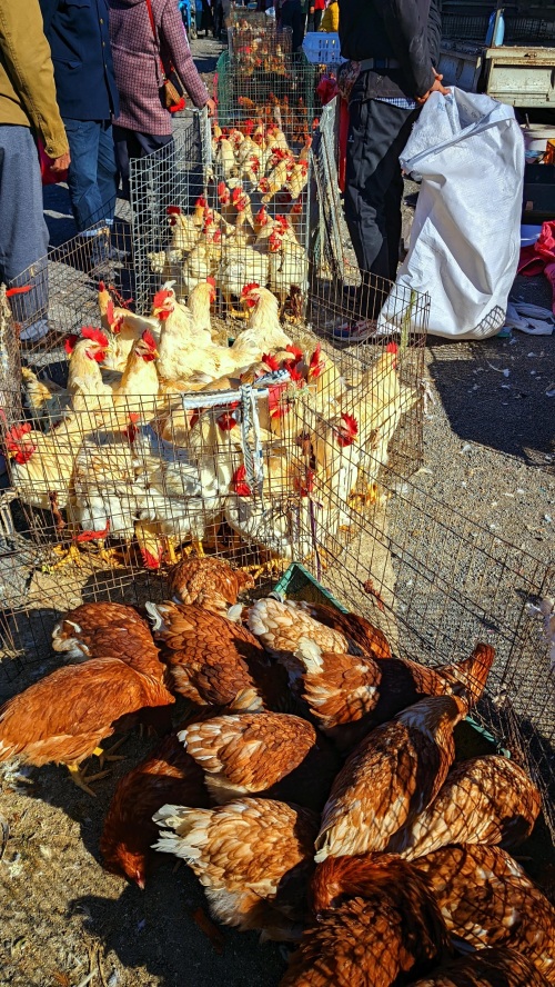 二是鲜。物品一看就很新鲜,蔬菜自不用说,水果都新鲜欲滴,虽不一定买但也忍不住掏出手机拍张照片。家禽个个羽毛鲜艳,气场十足。
