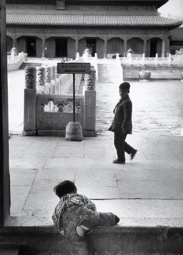 12、穿着开裆裤的小孩爬门槛。