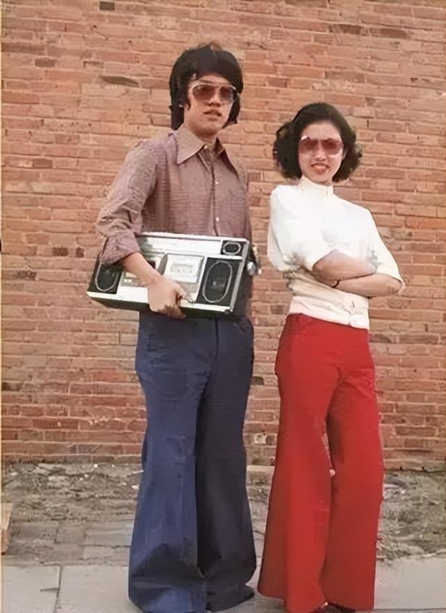 02.穿着拖把一样的扫地喇叭裤,戴着一副蛤蟆镜,身上再扛着一台收音机