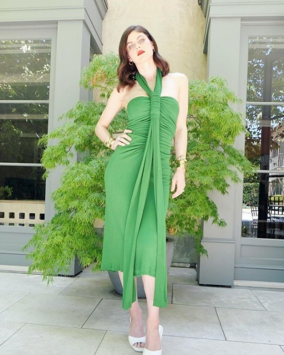 照片中,36岁的亚历珊德拉·达达里奥身穿绿色的抹胸连衣裙,蓝色的哈士奇眼十分地吸引人注意,艳丽的大红唇性感迷人。