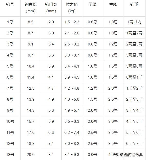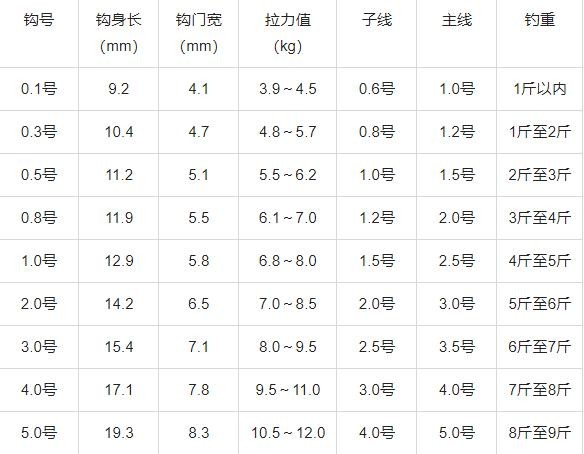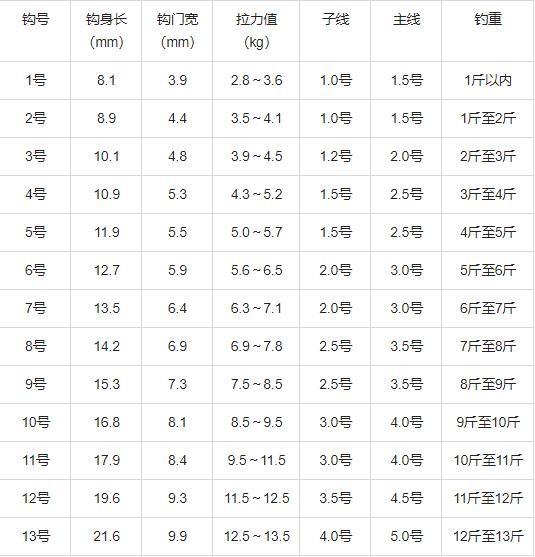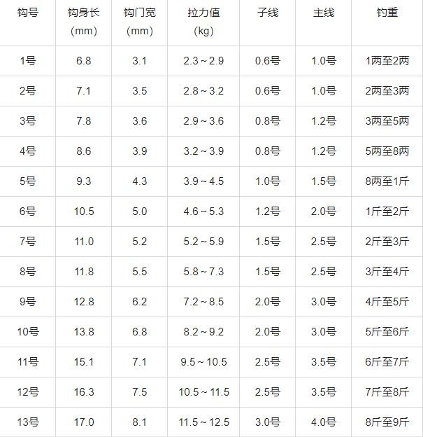 鱼钩规格尺寸一览表