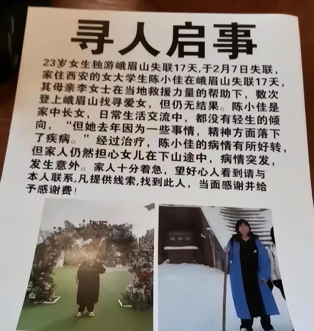 2月7日晚,陕西西安女大学生陈小佳在峨眉山游玩时失联,其母亲李女士自11日同友人抵达峨眉山,已寻找女儿16天,换了5家酒店,辗转于峨眉山各地。遗憾的是,至今还是没有女儿的下落。