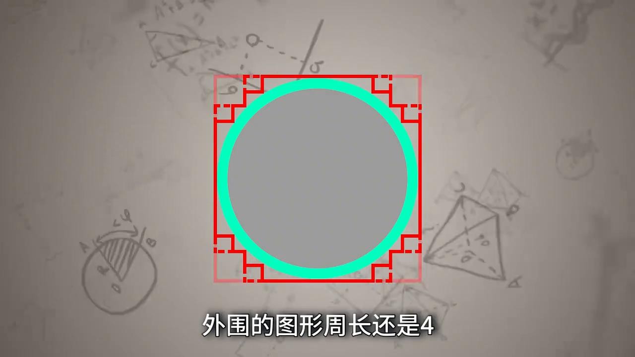 ·但随着不断的重复切角,这个图形会越来越接近圆,直到最终和圆重合,此时图形的周长依然是4。也就是说圆的周长等于正方形的周长都等于4,所以圆周率π也等于4。