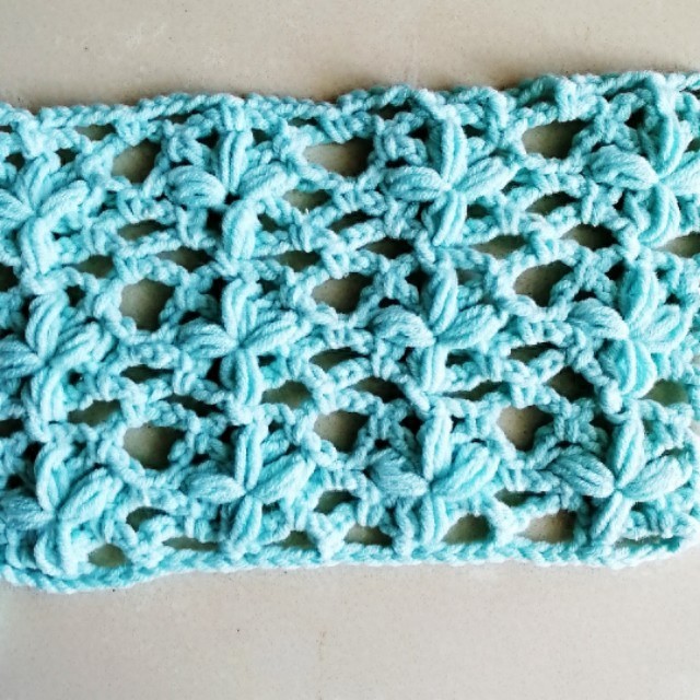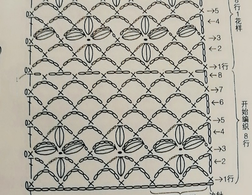 图解第3行的花样,钩拉线3次的泡泡针,再钩5辫子针,在原来的地方钩引拔针,然后是钩5辫子针,拉线3次的泡泡针,符号就这个复杂,其它的按照图解钩编。