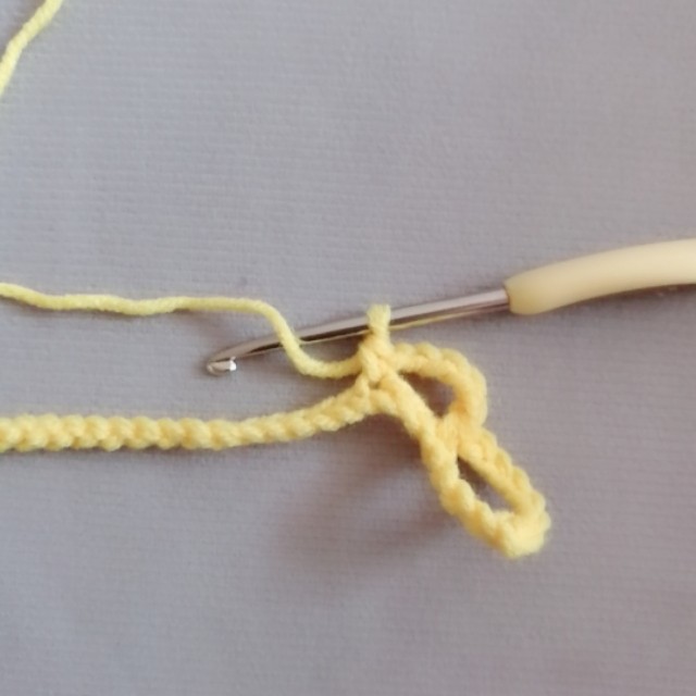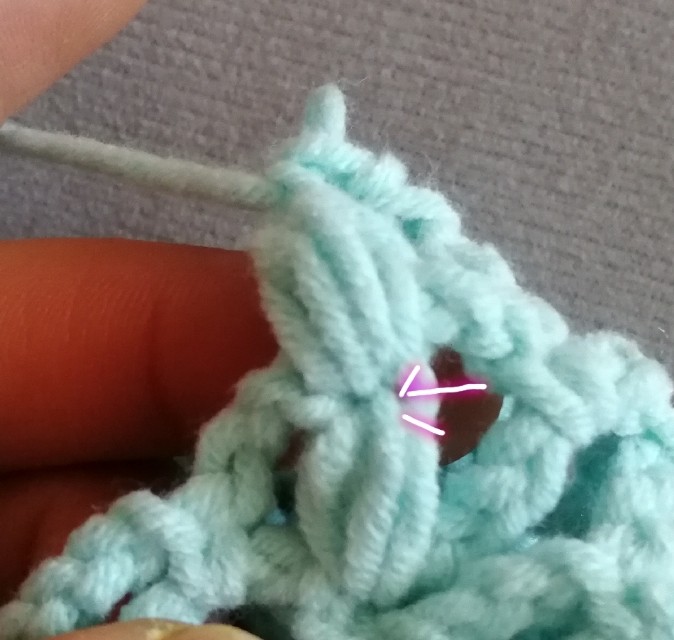 泡泡针是拉线3次,共6个线圈,需要分2次钩出线圈,第一次钩出图片标注的全部线圈,第二次钩出后面的一个线圈。