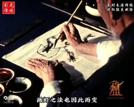 影像中可以看到齐白石老人手持毛笔在宣纸上挥洒笔墨。齐老虽然已经91岁高龄,但是依然精神矍铄,落墨成金,笔笔传神,寥寥几笔用墨色的深浅浓淡表现出一种动感。