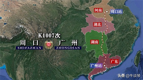 K1007次列车运行线路图:河南周口开往广东广州,全程1529公里