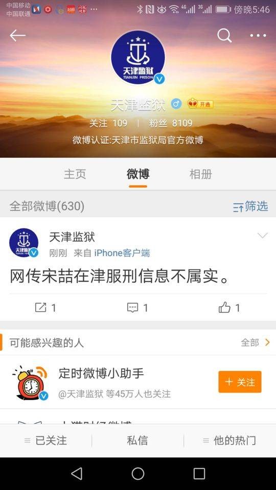 这位工作人员称,通过查阅了所有的档案资料,目前,宋喆并没有转到天津的监狱服刑。刚刚,天津监狱官方微博发布信息:网传宋喆在津服刑信息不属实。