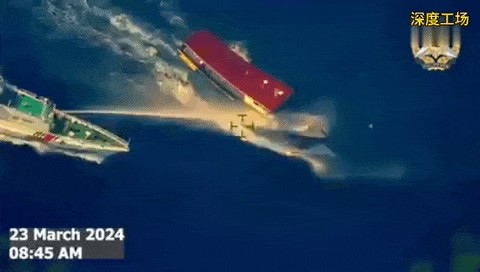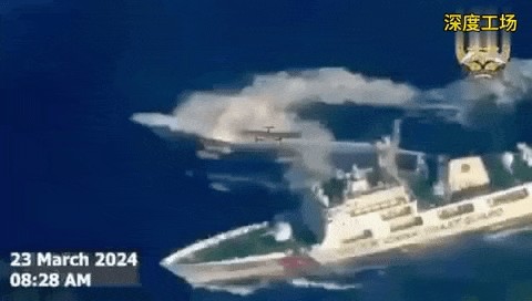 菲律宾海警船无视我方警告,加足马力强行冲卡。仁爱礁搁浅菲律宾