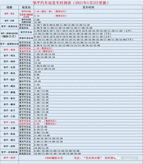 齐鲁网·闪电新闻1月3日讯 1月3日,记者从滨州邹平市汽车站获悉,邹平汽车站2021年发车时刻表更新,提醒市民注意收藏,不要错过时间。