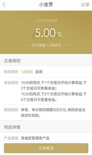点击进入一贯小金贯,内有交易规则和项目详情的说明(如起投金额1000元及计息规则等)。这里有一点需要提醒大家,平台承诺使用恒丰银行卡投资一贯小金贯,资金赎回实时到账,其他银行卡则承诺T+1日到账。不过细心的小编进行体验后发现,虽然绑定的不是恒丰银行卡,但还是在赎回约4分钟后,收到了银行款项到账的信息。