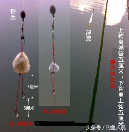 用饵料把爆炸钩进行包裹,注意保证饵料的粘度,不然很容易就散开。当爆炸钩进到水里且沉入水底之后,大概4分钟左右即可溶解开。在这之前,各位钓友可以先在桶里进行测试。鱼钩的话,包裹在雾化区的饵料里,当有鱼儿吃饵料的时候,鱼钩会一并进入鱼嘴。鱼四、浮钓