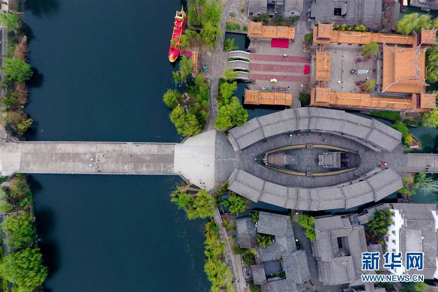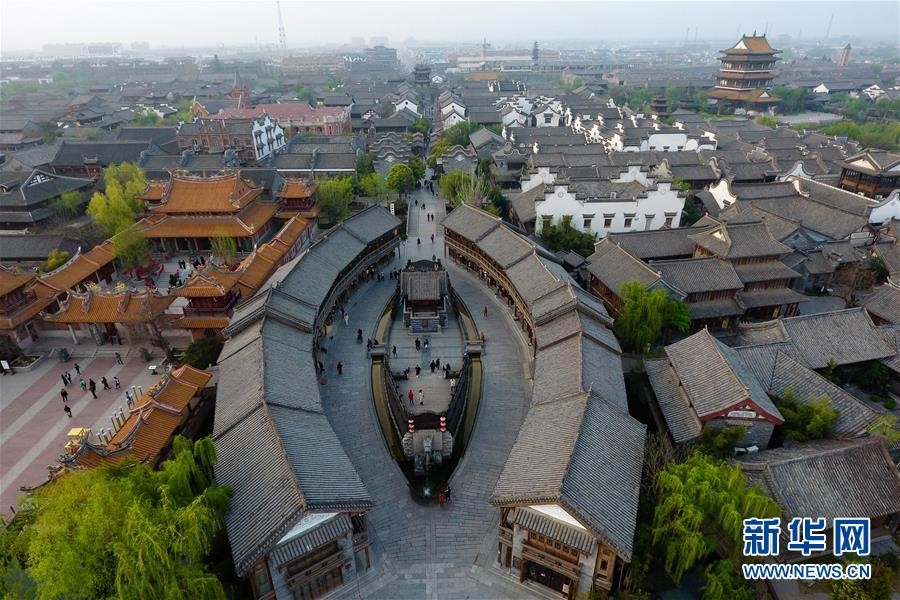 4月7日航拍的台儿庄古城。山东省枣庄市台儿庄古城位于京杭大运河沿岸,是明清时期有名的“水旱码头、商贸重镇”,一度“商贾迤逦,一河渔火,歌声十里,夜不罢市”,但是于1938年毁于日军炮火。