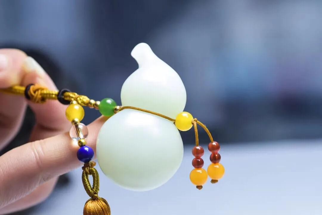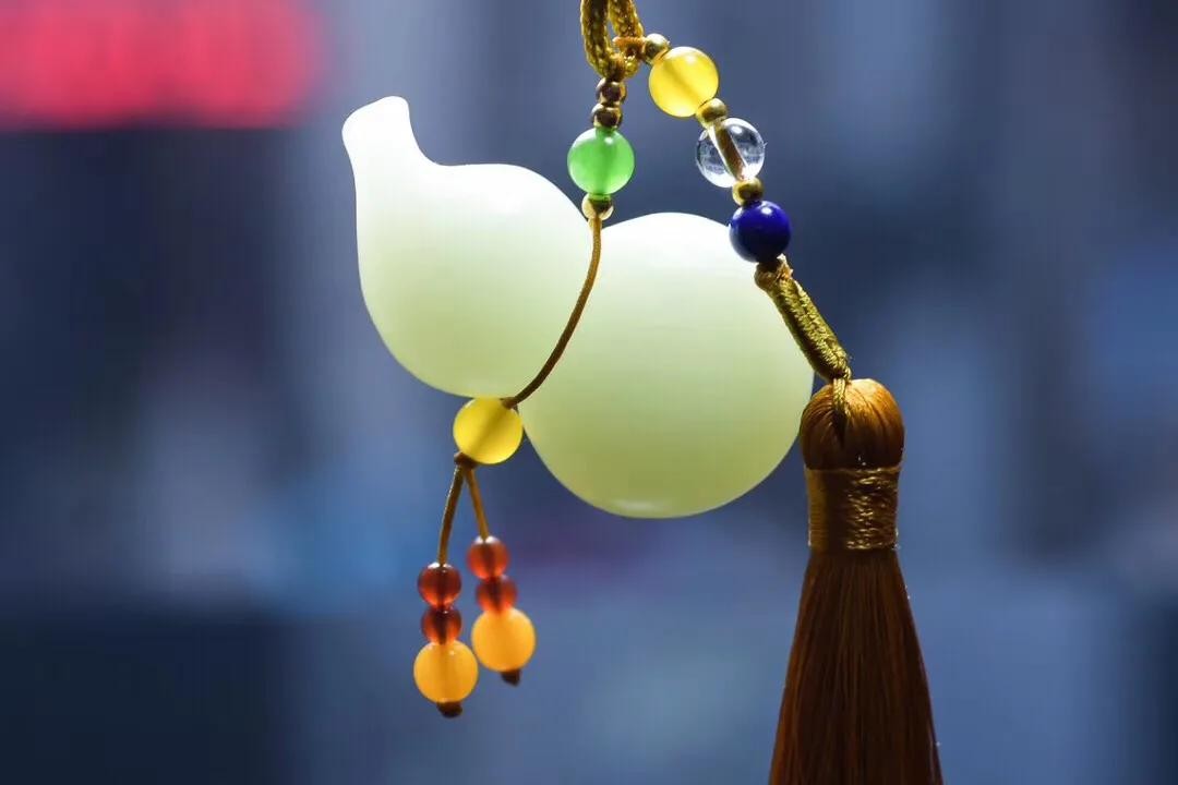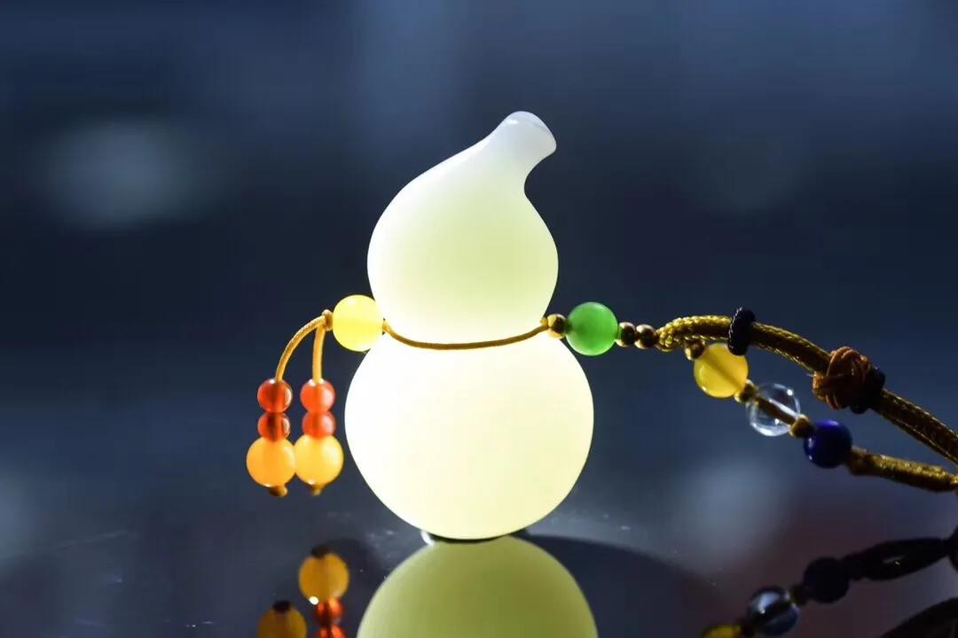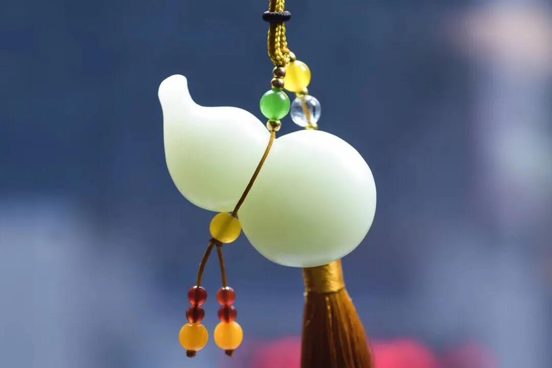 质地细腻,油性十足,整体雕琢一葫芦,生动逼真传神,造型精美,抛光精细。葫芦是道教和佛教的圣物,它肚大口小,可以吸收储蓄自然界万物精华,极其具有灵性。寓意保平安。