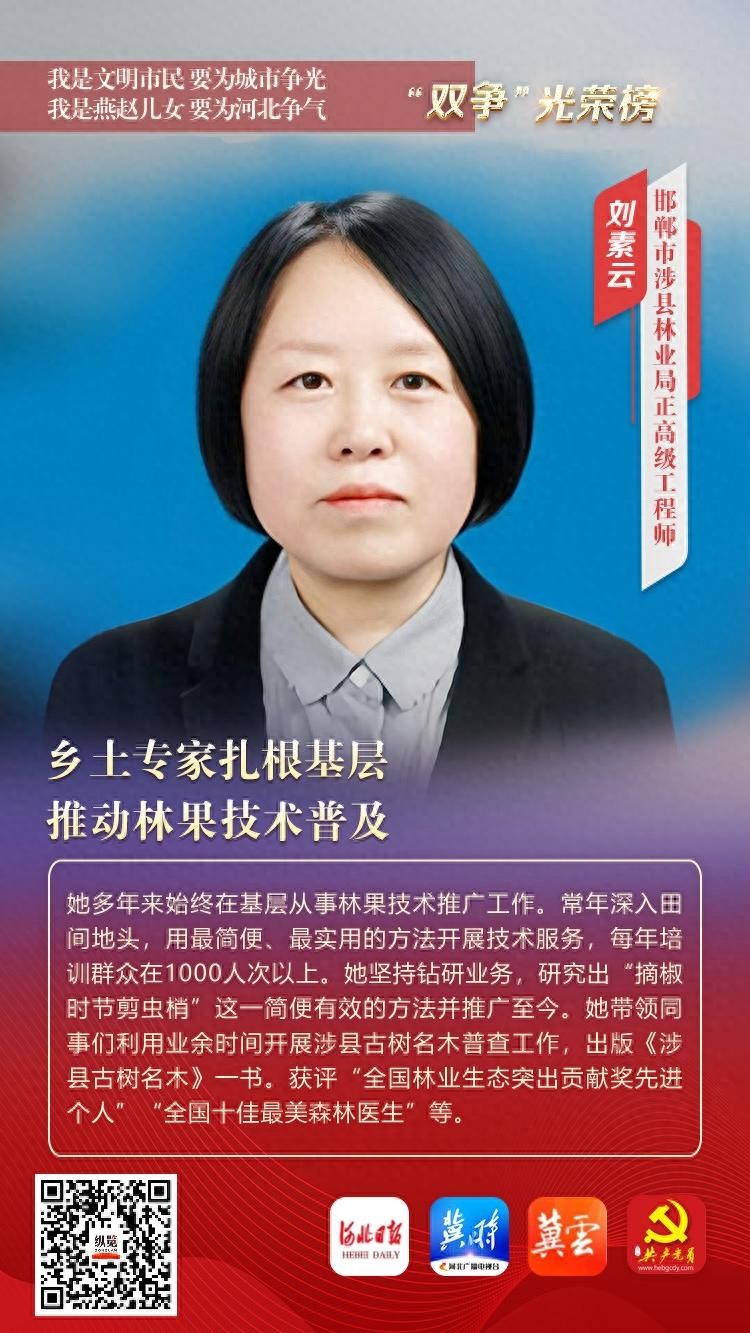 她多年来始终在基层从事林果技术推广工作。常年深入田间地头,用最简便、最实用的方法开展技术服务,每年培训群众在1000人次以上。她坚持钻研业务,研究出“摘椒时节剪虫梢”这一简便有效的方法并推广至今。她带领同事们利用业余时间开展涉县古树名木普查工作,出版《涉县古树名木》一书。获评“全国林业生态突出贡献奖先进个人”“全国十佳最美森林医生”等。