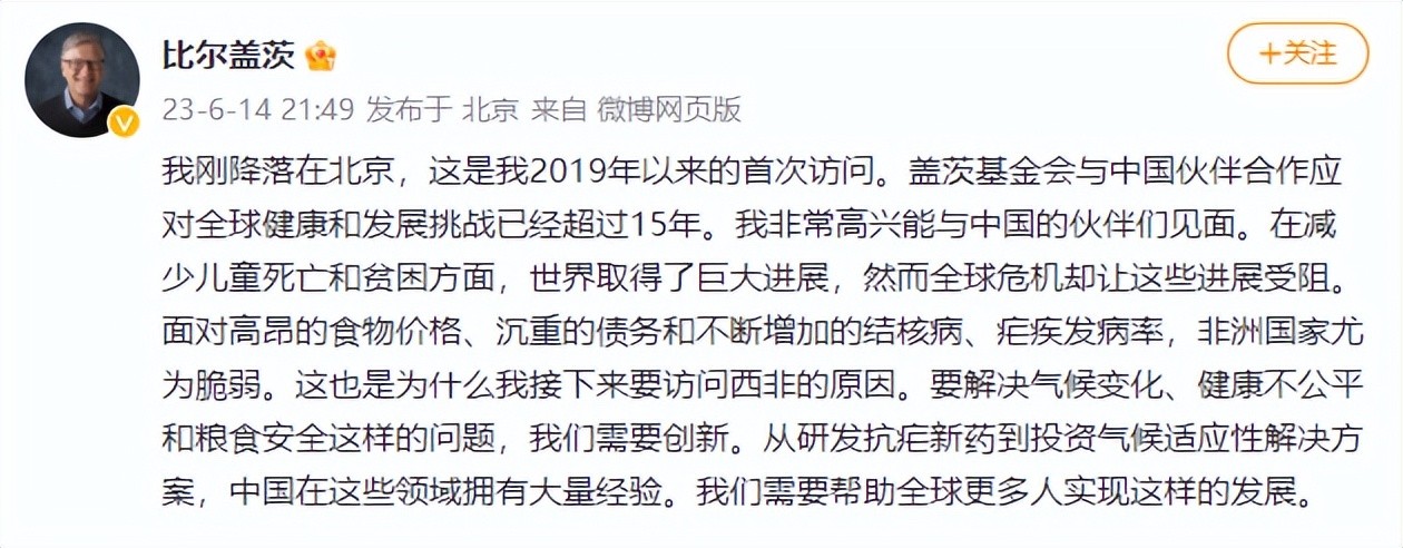 6月14日晚,微软公司创始人比尔·盖茨在微博发文称,他已抵达北京。