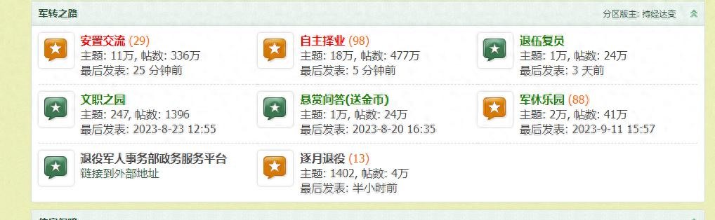 最近军转网电脑版关了又开,登上去看看,感觉数据够有趣。主要是各版块的活跃度。大家可以看一看: