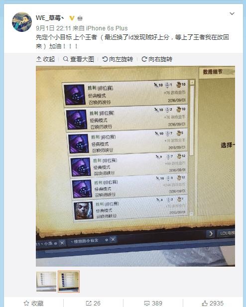 草莓近日发微博说先定个小目标,上个王者!(最近换了ID发现贼好上分,上了王者在改回来)