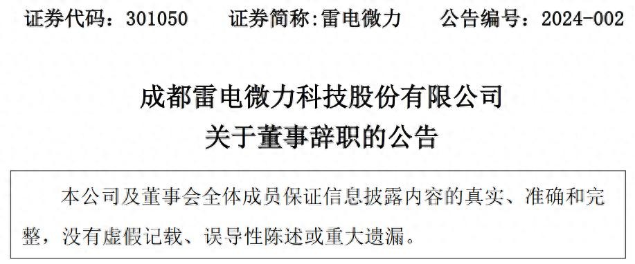 雷电微力(301050)于1月12日发布晚间公告称,成都雷电微力科技股份有限公司(以下简称“公司”)董事会近日收到董事陈章良先生提交的书面辞职报告,陈章良先生因其工作调整,申请辞去公司董事职务,辞职后不在公司担任任何职务。