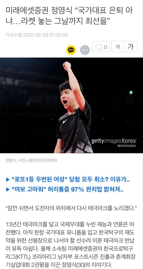 韩网新闻也是发布了关于郑荣植的相关采访,他说:“退出国家队并不代表退役,我想一边打国内联赛一边冷静下来给自己充电。在乒乓球台上全力以赴的想法没有改变。我会稍作休息,以挑战者的位置再次瞄准国家队。”
