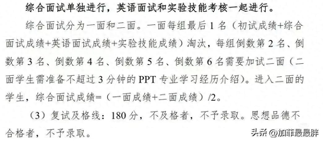 正常情况下,复试只有一轮综合面试。但南京大学这次设置了两轮综合面试。如果第一轮面试排名倒数第一,那么直接被淘汰。而倒数第六名至倒数第二名的学生,还需要加试二轮面试。这样的规则,对于学生的心理素质要求更高。尤其是进入二面的学生,将会承受更高的压力。