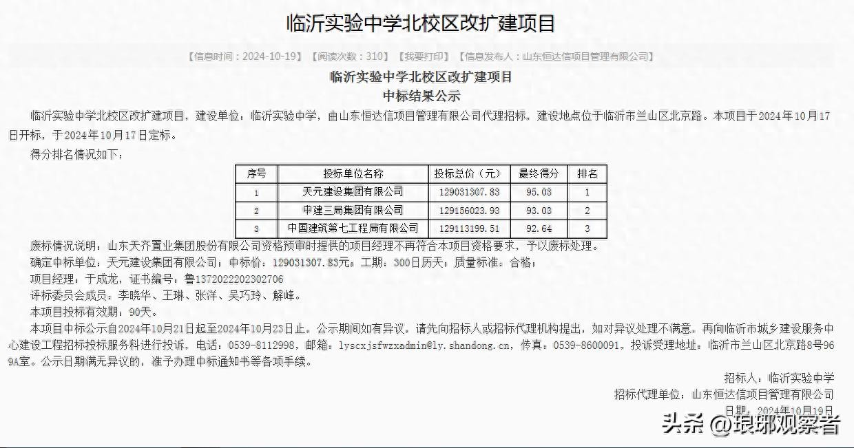 10月19日周六,临沂实验中学北校区改扩建项目中标结果公示,确定中标单位:天元建设集团有限公司;中标价:129031307.83元;工期:300日历天。