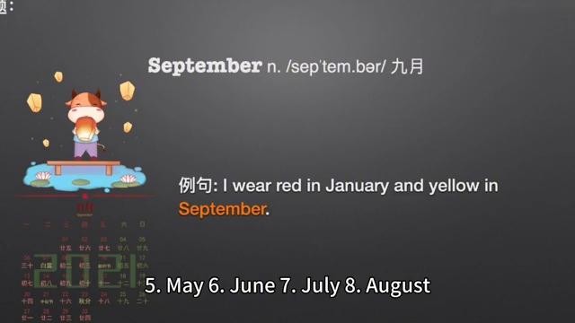 例句:Iwear red in January and yellow in September.