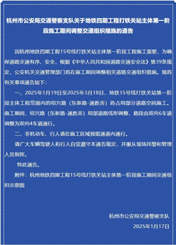 刚刚,“杭州交警”公号发布消息:地铁四期工程打铁关站主体第一阶段施工期间,相关交通组织措施将要调整。