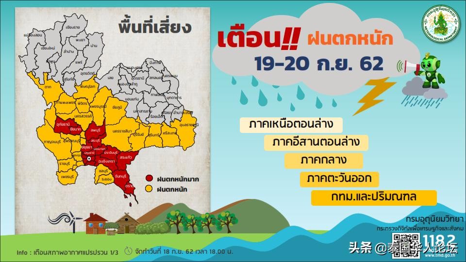 泰国新泰日报社讯 泰媒报道,9月18日,泰国气象部门发布未来一周气象预警。9月19日至25日期间泰国多地天气多变。19日至22日,泰国北部、东北部、中部、东部以及曼谷周边局部地区将出现大到暴雨天气。23日至26日,东北部、北部以及中部将陆续开始降温,气温降低3至5℃。提醒市民注意保暖,谨防着凉感冒。