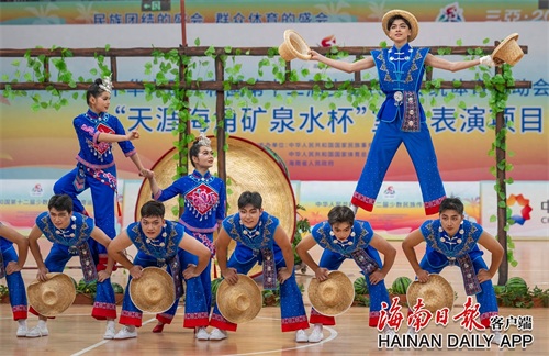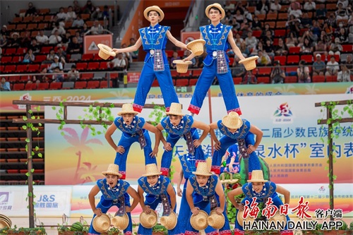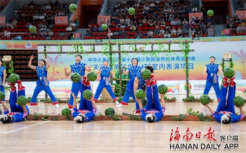 11月26日,第十二届全国少数民族传统体育运动会表演项目(室内)在三亚市体育中心体育馆举行,湖北队表演的《顶瓜瓜》引人注目。表演者们充分利用手中的“西瓜”和帽子两种道具,通过高难度的动作技巧赢得观众阵阵掌声。