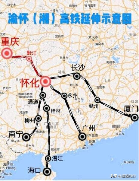 怀化是我国中部地区与西南地区的连接点,西南地区的重庆到怀化的高铁,沿途经过南川、武隆、彭水、黔江、酉阳、秀山、松桃、铜仁、麻阳等地,这条高铁建成之后,怀化到重庆更加便利。