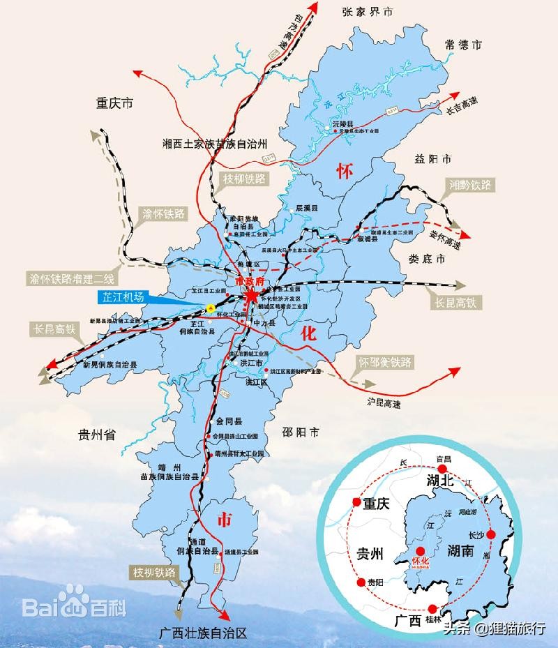 怀化市北边有湘西州、张家界,西边是贵州省,南部与广西桂林接壤,周围都是风景美丽的地方,怀化的山水景色也很美。虽然怀化的地形山多、河流多,但这里的交通条件非常棒,是个四通八达的交通枢纽。