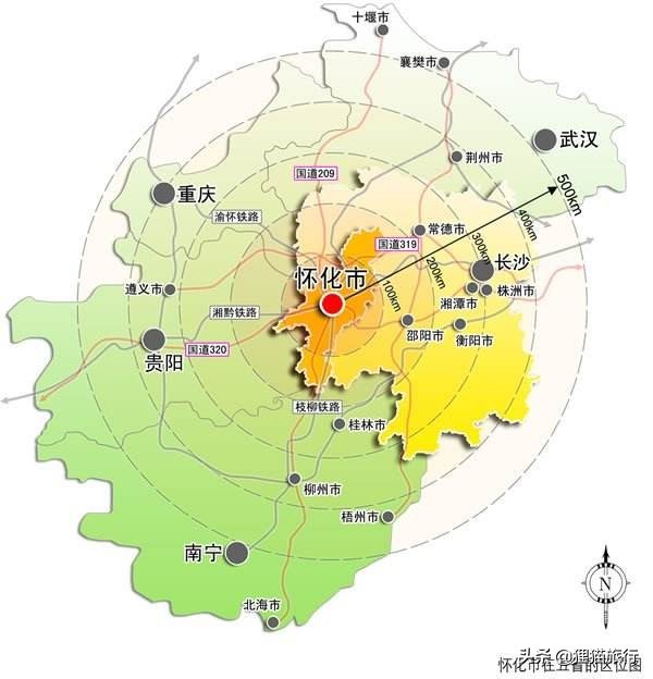 怀化周边方圆500公里范围内,有武汉都市圈、成渝城市群、长株潭城市群、贵阳都市圈、南宁都市圈、珠三角等经济发达区域。怀化是长沙、武汉往西南方向的重要节点,是成都、重庆到珠三角的重要通道。