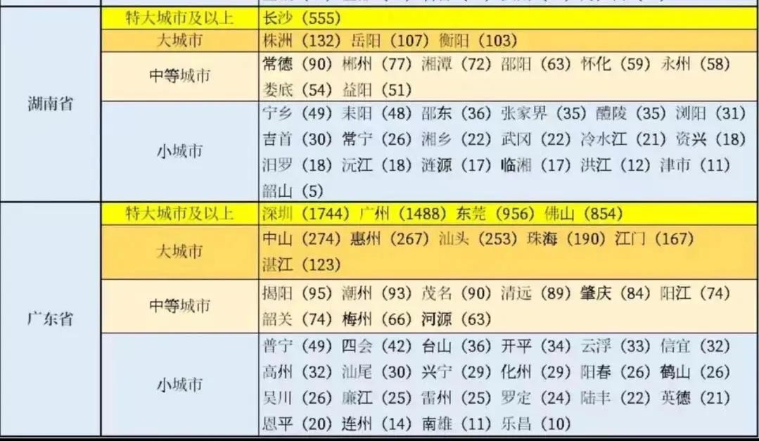 广东省城市规模:4个特大城市,6个大城市,9个中等城市