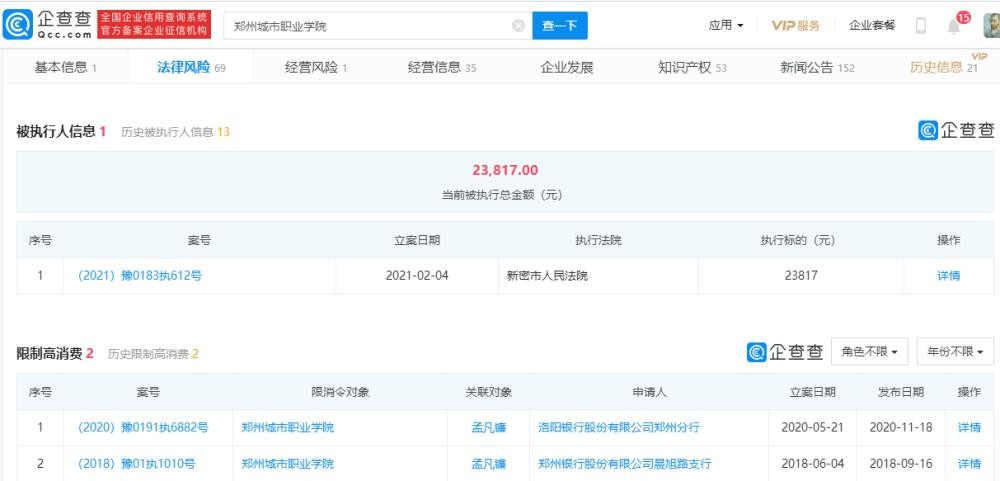 企查查APP显示,郑州城市职业学院成立于2009年,属于民办非企业单位,注册资本1.23万元人民币,法定代表人孟凡镰。企查查显示,郑州城市职业学院已成被执行人,还有2条限制高消费信息。