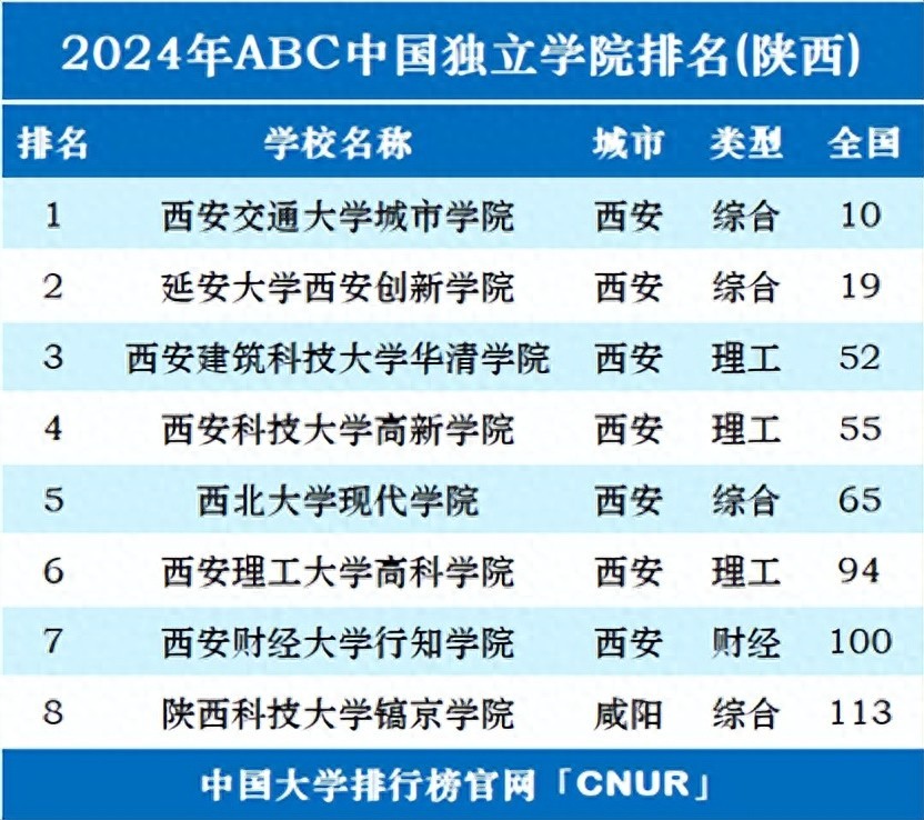 排名结果显示,西安交通大学城市学院排名全国第10、省内第1,延安大学西安创新学院排名全国第19、省内第2,西安建筑科技大学华清学院排名全国第52、省内第3,西安科技大学高新学院排名全国第55、省内第4,西北大学现代学院排名全国第65、省内第5,其他上榜的还有西安理工大学高科学院、西安财经大学行知学院和陕西科技大学镐京学院。
