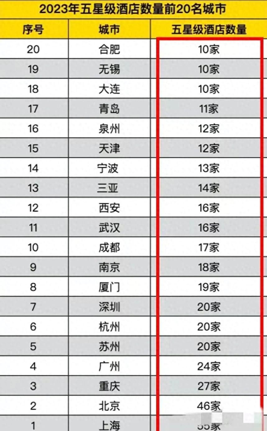 国内城市五星级酒店总量排名,重庆第三,深圳第七,广州与武汉呢