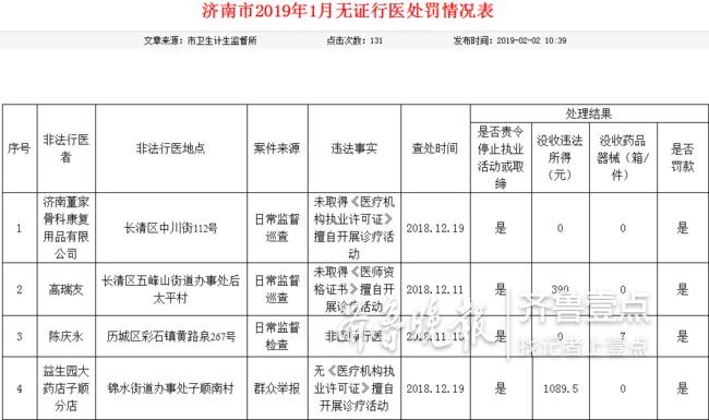 日前,济南市卫生和计划生育委员会公布2019年1月无证行医处罚情况。济南董家骨科康复用品有限公司等8家单位和个人,因为非法行医被处罚。其中,执法部门从位于锦水街道办事处子顺南村的益生园大药店子顺分店,没收违法所得1089.5,并处以罚款。