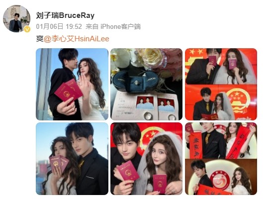 1月6日,李心艾、刘子瑞在社交平台官宣结婚。李心艾,原名李真,1990年4月10日出生于陕西省西安市,中国内地影视女演员,曾出演《栀子花开》《锦绣未央》等作品。