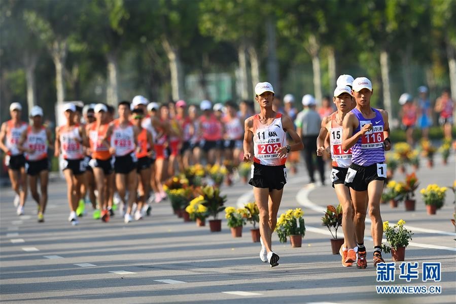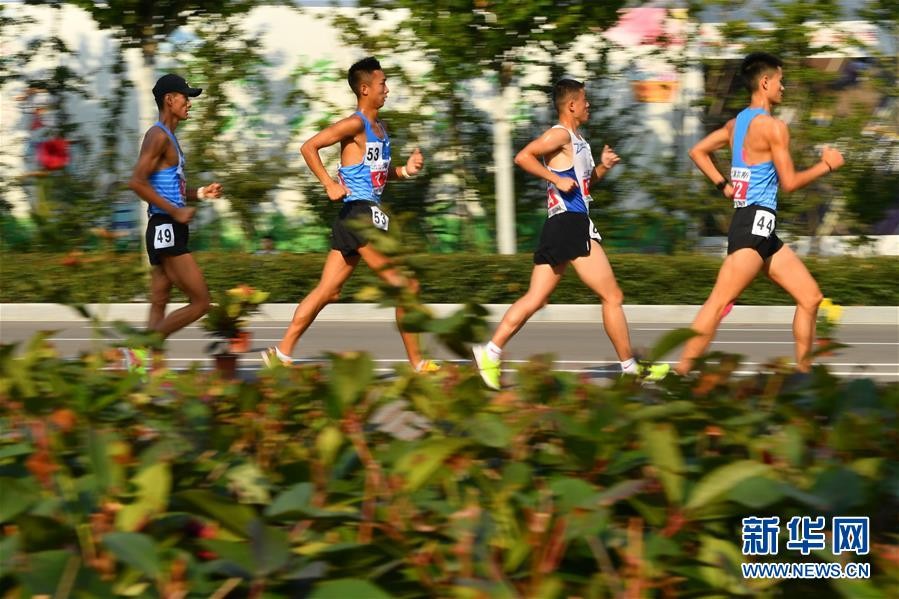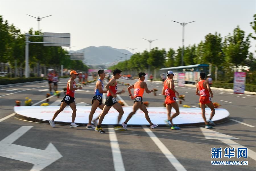 9月19日,参加男子成年组20公里竞走的运动员在比赛中。当日,2020年全国竞走锦标赛男子成年组20公里竞走比赛在山东省泰安市举行。 新华社记者 朱峥 摄