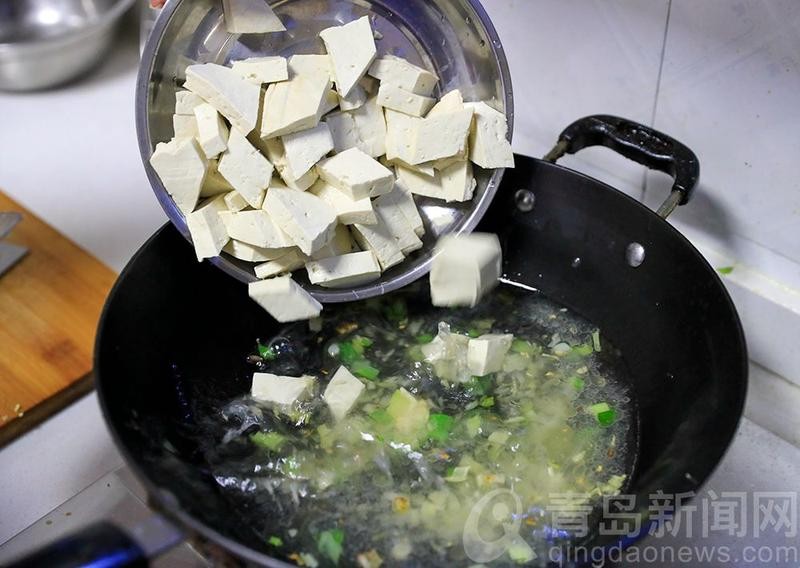 翻动均匀后盛盘,即可享用到味道鲜美的经典青岛家常菜笔管鱼炖豆腐啦。(记者庞为摄影魏世洲)