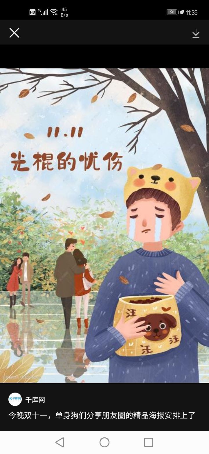 明天就是双十一了,“双十一”顾名思义乃是每年的11月11日,这一天也叫光棍节,因四个阿拉伯数字“1”并排就像赤条条四个光棍一样,所以如此说。后来又叫购物节,在2008年,天猫商城淘宝网推出线上购物,打折促销,脱光割肉甩卖,当年的收入数字惊人,几家电商合起来收入高达近3000亿,以后每年就成了购物狂欢节。有不少年轻人选择这一天结婚,告别单身狗的生活,这也是值得庆祝的事情,所以,参与狂欢的人不少年轻人别出心裁,狂撒狗粮,增添喜庆气氛。估计今年的电商又笑了,前几天拼多多就推出“砍一刀”活动,搞得轰轰烈烈,有的还真砍出了折叠电动车。朋友们!尽情狂欢吧,摆脱单身的寂寞,获取疯狂购物的欢乐。