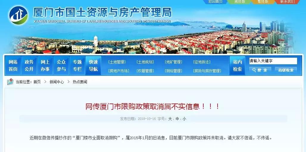 近期在微信传播炒作的“厦门楼市全面取消限购”,属2015年1月的旧消息,目前厦门市限购政策并未取消。请大家不信谣,不传谣!